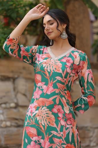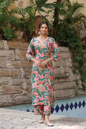 ANNI DESIGNER Women’s Cotton Blend Straight Printed Kurta with Palazzo (Chinki Green_L_Green_Large)