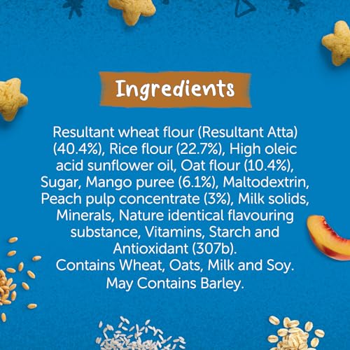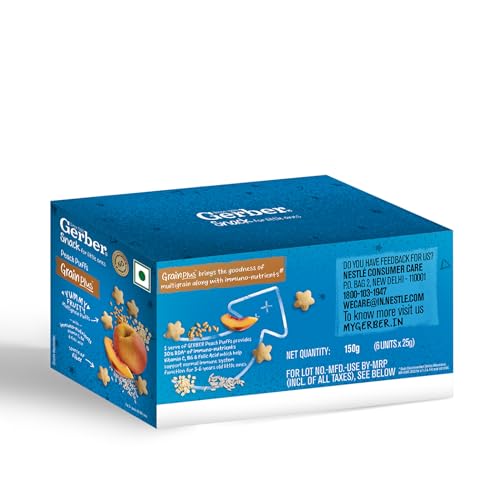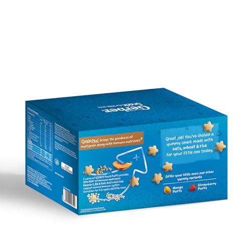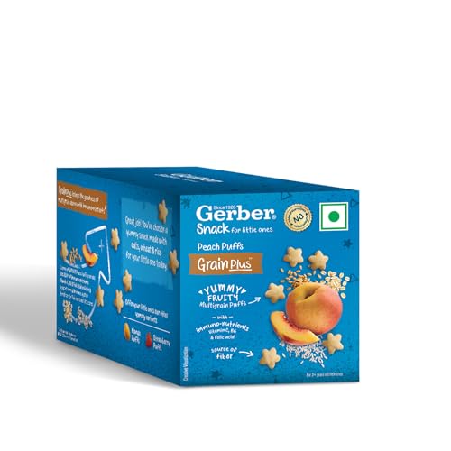 Choose a Yummy & Nutritious Snack for Your Little Ones! With 90 years of global nutrition expertise, we bring you GERBER Puffs – A yummy, nutritious snack for little ones made with multigrain – oats, wheat and rice. Are you worried your kid’s snacks are full of preservatives & added colours? GERBER snack puffs are made with no added colour or preservatives and are a source of fibre. 1 serving of these tasty peach puffs provides your kid with 30% RDA^ of immuno-nutrients Vitamin C, B6 & Folic Acid that help support normal immune system function for 3-6 years old little ones. Also these puffs are a source of fiber for your little ones. Grab one for your little one! ^Basis Recommended Dietary Allowances, NN-ICMR 2020 for a 1-3 & 4-6-year-old child. Storage Instructions: Store in a cool, dry and hygienic space. After opening the pack, store it in an empty, clean, dry and airtight container. Use within 2 weeks of opening the pack.