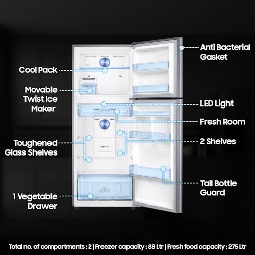 Interior Description : Fresh Food Capacity : 275 Ltr | Freezer Capacity : 88 Ltr | Total no. of compartments : 2 | Shelves : 2 | Vegetable Drawers : 1 | Shelf Type : Toughened Glass Shelves | Anti Bacterial Gasket |