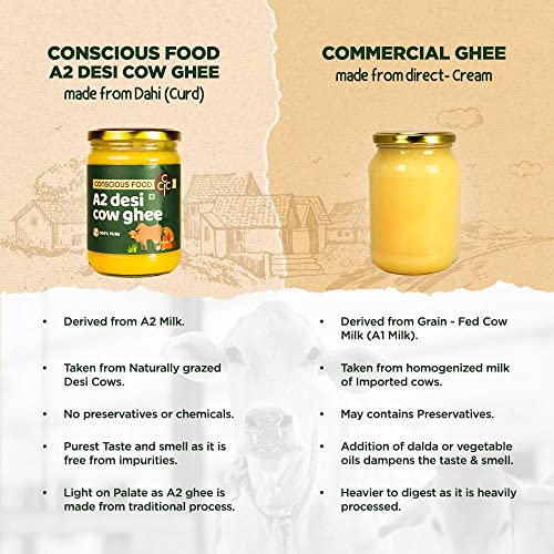 3. Naturally grazed Desi Cows: Conscious Food A2 Ghee is made by Desi cows.A2 protein, which is present in Desi cow milk, contains more amino acids than regular cow milk, making it healthier overall.