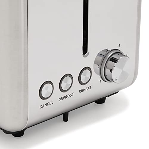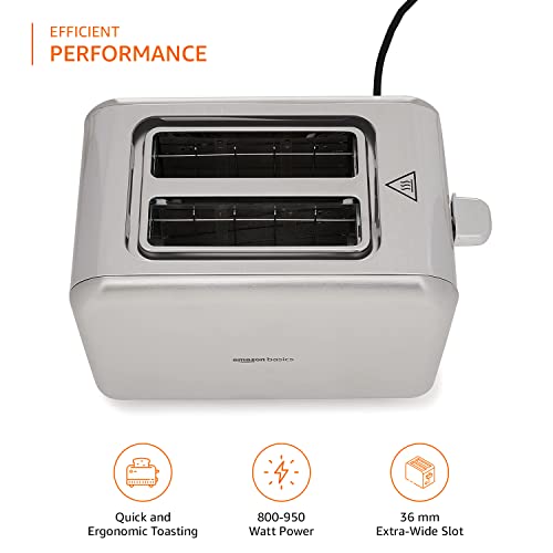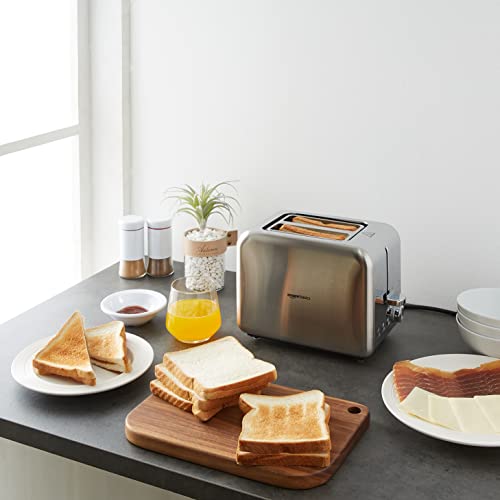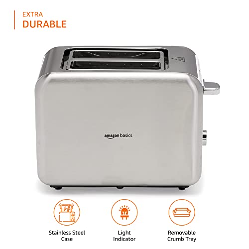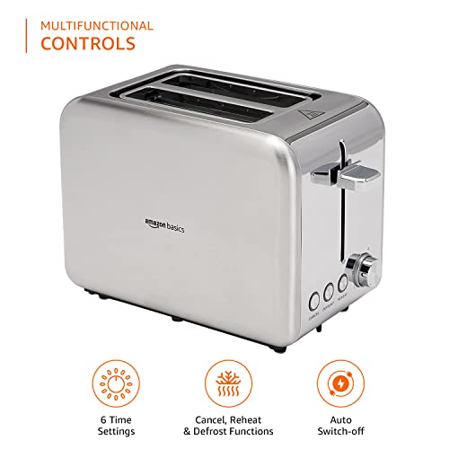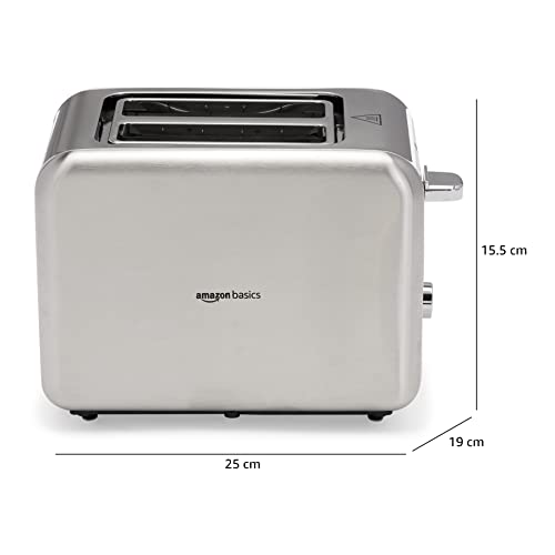 The Amazon Basics Toaster has been designed for a modern kitchen and the shell is made from brushed stainless steel .