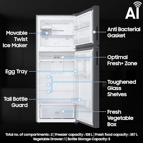 Interior Description : Fresh Food Capacity : 357L | Freezer Capacity : 108L | Total No Of Compartments : 2 | Drawers : 1 EA | Shelves : 2 EA | Shelf Type : Toughened Glass Shelves | Anti-Bacterial Gasket | Bottle Storage Capacity : 6