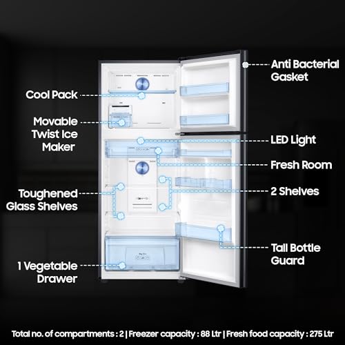 Interior Description : Fresh Food Capacity : 275 Ltr | Freezer Capacity : 88 Ltr | Total no. of compartments : 2 | Shelves : 2 | Vegetable Drawers : 1 | Shelf Type : Toughened Glass Shelves | Anti Bacterial Gasket |