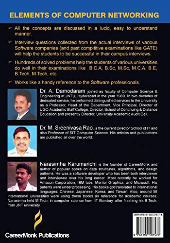 Computer networking is an integral and dynamically expanding component of information technology. To understand the evolving trends of networking, you need to be thorough with the basic concepts of computer networking. This book, Elements Of Computer Networking: An Integrated Approach (Concepts, Problems And Interview Questions) provides the resource for students of advanced graduate or undergraduate computer courses. The book places special emphasis on application-layer paradigms as well as application programming interfaces, thereby facilitating a real-time knowledge gaining process with protocols and networking concepts before going into protocol stack and more complex layers.Elements Of Computer Networking: An Integrated Approach (Concepts, Problems And Interview Questions) is a collaborative effort of authors Narasimha Karumanchi, Dr A Damodaran and Dr Sreenivasa Rao M. The book is comprised of 17 chapters, which include Transport Layer, Application Layer, Data Link Layer, Medium Access Control Sublayer, Physical Layer and Network Security. The authors have designed the book so that it is easily grasped by students. The book has been the popular choice for students of advanced networking courses owing to the solid reputation of the authors. Published by CareerMonk Publications in 2014, the book is available in paperback format.Key Features: The book is designed in an easy to read format keeping students in mind. The book contains interview questions procured from real interviews of different software companies. It also contains hundreds of solved problems.