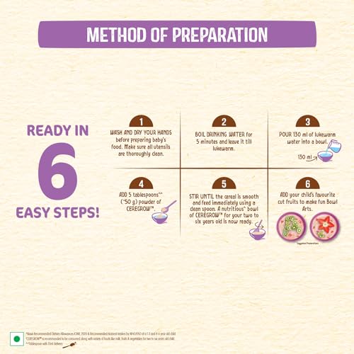 Ceregrow Growing Up Cereal is a nutritious cereal with the goodness of multigrain, milk & fruits designed to meet the nutritional needs of your child. It’s packed with nourishment and benefits of 16 vitamins & minerals to help support the normal physical growth & development of the child. These cereals for kids is a rich source of Iron that helps in normal cognitive development. Crafted for your li’l one, it has immuno-nutrients like Vitamin A, C, D, Iron & Zinc which help support normal immune system function.