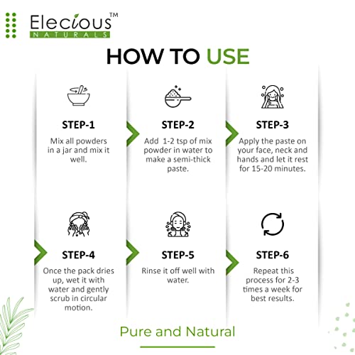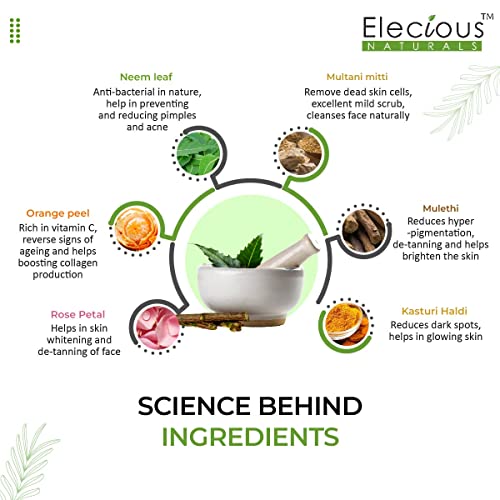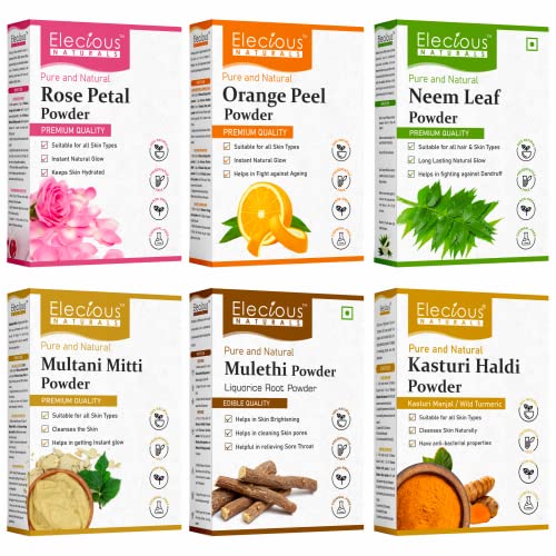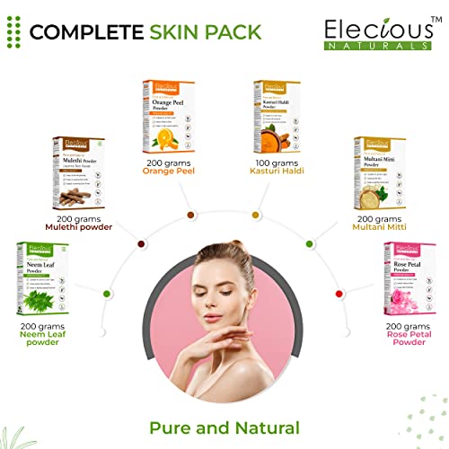 Elecious Complete Skin care kit combo- Contains 6 Products (Mulethi powder, Multani Mitti powder, Kasturi Haldi powder, Orange peel powder, Neem powder & Rose petal powde) | 100% Natural and Preservative Free | Make Skin glowing and Healthy