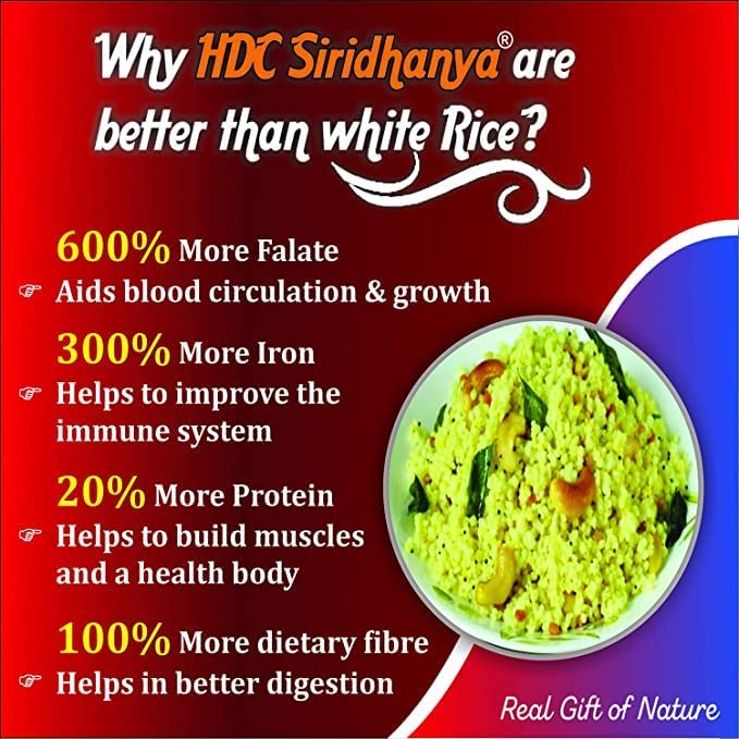 HDC Siridhanya Millets contain 100% more Dietary Fiber than White Rice. Helps in better digestion and makes the meal feel fuller.