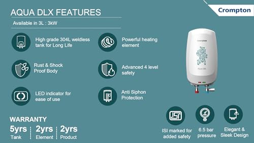 Powerful Heating Element: The 3000/4500-watt high quality copper heating element material ensures fast heating of water and provides the perfect hot water anytime of the day. The Hydrajet is suitable for use in high rise buildings and can withstand pressure up to 6.0 kg/cm2. Your Rapidjet comes with a durable body that offers toughness and heat resistance. Crompton Instant Water Heaters come with Capillary Thermostat, automatic Thermal Cut-Off, a Pressure Release Valve and a fusible plug to give 4 layers of safety.