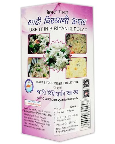 Special Ingredients:Dadaji Camel Brand Mughlai Meetha Attar is crafted using rare and precious botanical ingredients sourced from the finest regions.Special ingredients in Biryani essence include saffron for its rich color and floral flavor, cardamom for warmth, rose water for sweetness, and kewra water for exotic aroma