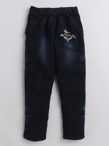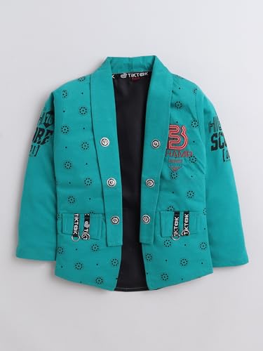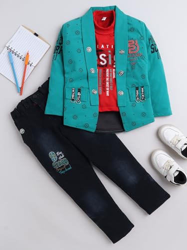 This clothing set consists of T-shirt & jeans with jacket , printed T-shirt, has a round neck, short sleeves Navy blue solid jeans has a button closure