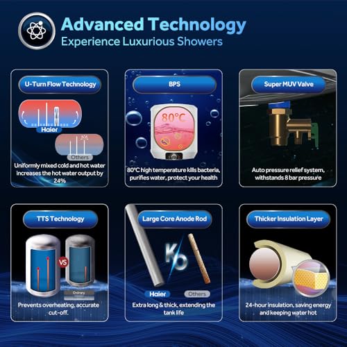 Safety: Haier water heater with shock-proof technology and multiple layers of leak protection ensure your safety. PR Valve releases excess pressure, and TTS technology protects against overheating