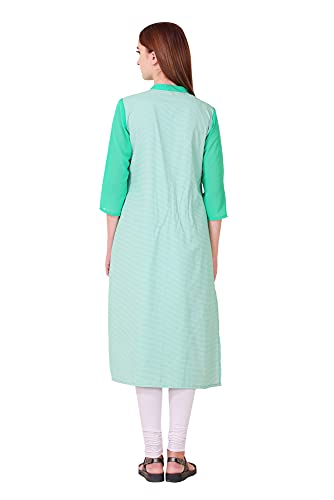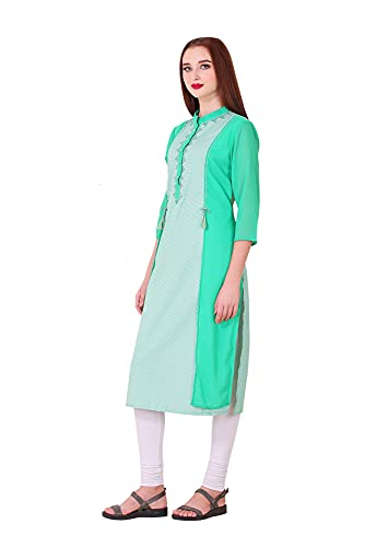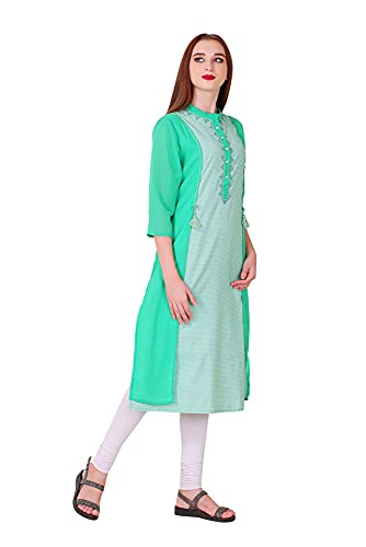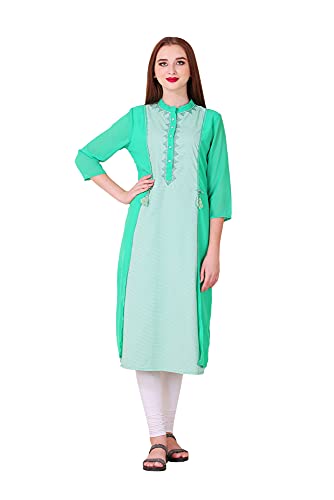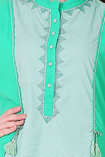 Spendworth Viscouse and Zeorgette Layered Straight Mandarin Collar Green Kurti with Tussels and Thread Work and Bead Work On Front with Side Slits