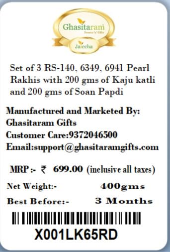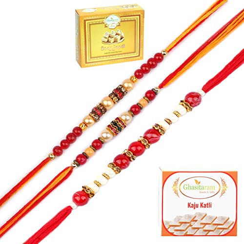 Set of 3 beautiful traditionally designed with beads and stones to make it unique in its own way..This comes with kaju katli or Soan Papdi sweets which have been packed using Italian Technology for an Extended Shelf Life (30 days).Free Roli, Chawal and chandan pouches go along with this product.