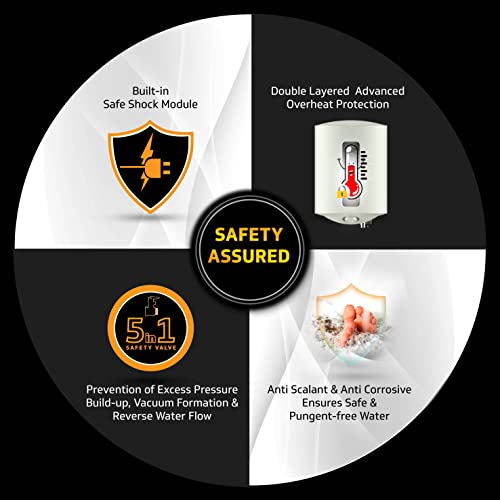 SAFETY ASSURED: Built-in Safe Shock Module to prevent electric shocks, Advanced Thermostat & Thermal Cut-out Mechanism provides Dual Overheat Protection, 5-in-1 Multi-function Safety Valve prevents Excessive Pressure Build-up, Vacuum Formation & Reverse Water Flow