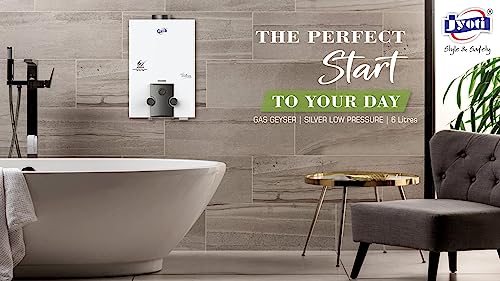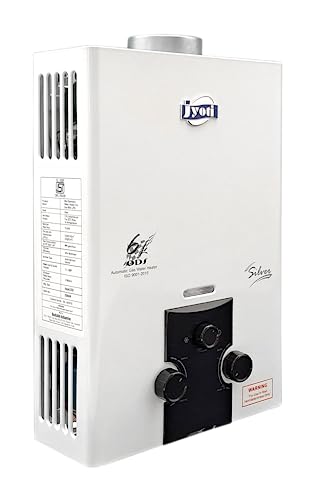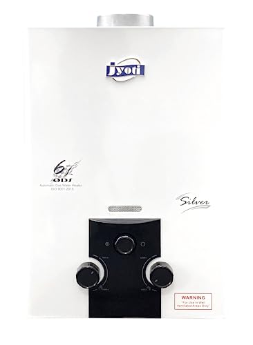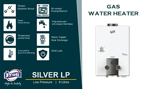 Jyoti Silver LP Instant Gas Geyser is a fully automatic gas water heater that provides instant running hot water with a 6Ltr heavy copper heat exchanger/tank. Made in India with safety features such as Oxygen Depletion Sensor, Flame Failure Device, Overheating Protection, and Child Lock to ensure maximum safety.