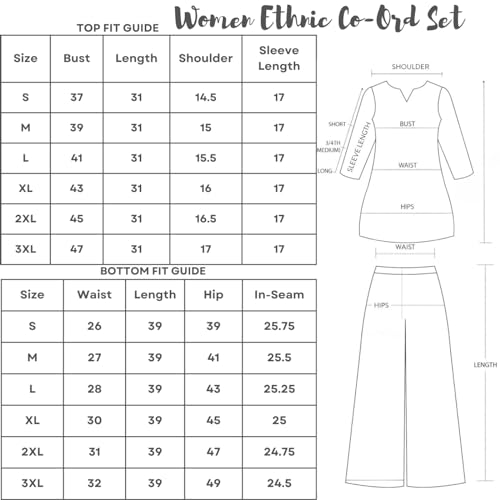 Care Instructions: Hand Wash OnlyFit Type: RegularFabric:- Rayon Kurti Set || Print:- Geometric Co-Ord Set for Women || Type:- Women’s Kurtas Set.Package Content:- 1* Shirt Kurta & Pant Sets || Neck:- Collar Neck || Sleeve:- Regular 3/4 Sleeve || Two Piece: Printed Top + Pyjama (Pyjama Sets for Women)Pant:- the Pant Has a Wide Leg Style & an Elasticated Waistband || Top:- the Top Has Button Front 3/4 Sleeve Shirt.Occasion:- Beach Wear, Summer Wear, Hangouts, Picnic, Vacation Wear. Great Sleep Pajama Set, Women’s Loungewear, simple kurta set for women, fancy kurti set for women stylish, ethnic kurta set for women, casual kurta set, kurta set for women regular use, office wear kurta set for women, office wear for women formal set.PLEASE REFER ONLY INFOGRAPHIC IMAGE OF THE SIZE CHART FOR THE PERFECT SIZE OF YOUR PRODUCT TO THE PERFECT FIT FOR YOUR BODY TYPE.