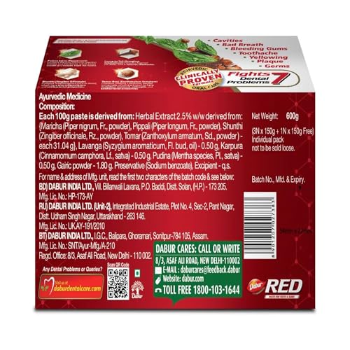 DABUR RED PASTE has a clinically proven formula that fights against 7 DENTAL PROBLEMS 1) TOOTHACHE, 2)CAVITIES, 3) plaque, 4) germs, 5) bad breath, 6) yellowing, and 7) bleeding gums