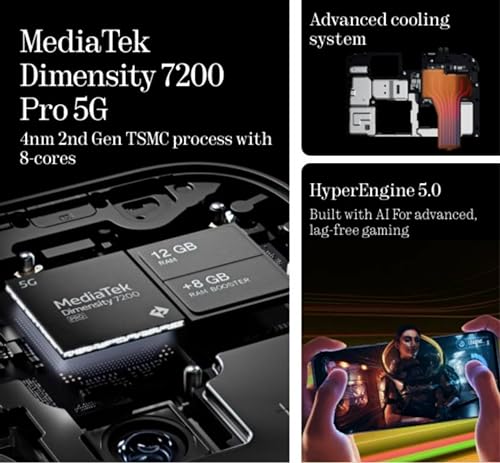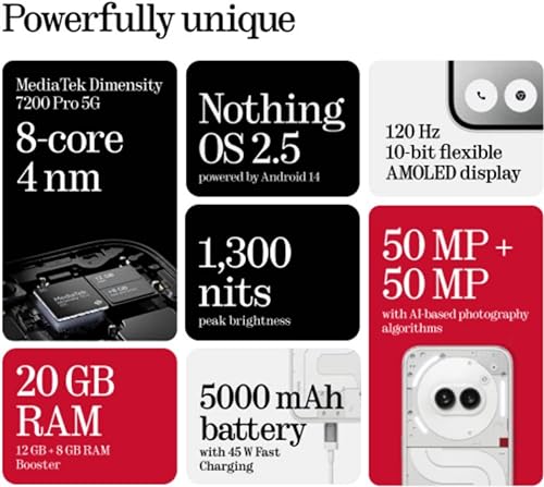 6.7-inch (2412×1084 pixels) FHD+ OLED flexible AMOLED display, 30-120Hz adaptive refresh rate, 240Hz touch sampling rate, 2160Hz PWM dimming, HDR10+, 10-bit color, 700 nits typical / 1100 nits outdoor / 1300 nits peak brightness, Corning Gorilla Glass 5 protectionUp to 2.8GHz Octa Core MediaTek Dimensity 7200 Pro 4nm processor with Mali-G610 MC4 GPU8GB LPDD4X RAM with 128GB UFS 2.2 storage, 8GB / 12GB LPDDR4X RAM with 256GB UFS 2.2 storageAndroid 14 with Nothing OS 2.5Dual SIM (nano + nano)50MP main camera with f/1.88 aperture, 1/1.56″ sensor, OIS, 50MP 114° ultra-wide camera with f/2.2 aperture, 4K at up to 30 fps, Action Mode32MP front camera with f/2.4 apertureIn-display optical fingerprint scannerUSB Type-C Audio, Stereo speakersDimensions: 161.74x 76.32x 8.55mm; Weight: 190gSplash resistant (IP54)5G SA/NSA (n1, n3, n5, n7, n8, n20, n28, n38, n40, n41,n66, n77, n78 bands), Dual 4G VoLTE, Wi-Fi 6 802.11ax (2.4GHz/5GHz) MIMO, Bluetooth 5.3, GPS, USB Type-C, NFC5000mAh battery with support for 45W wired charging.
