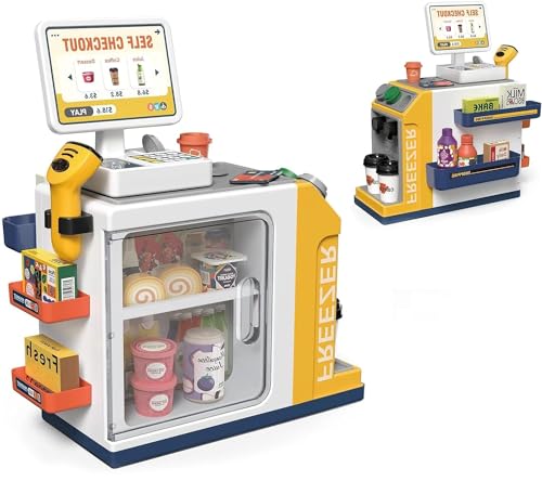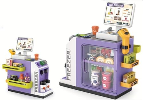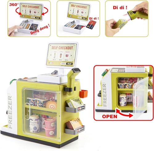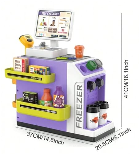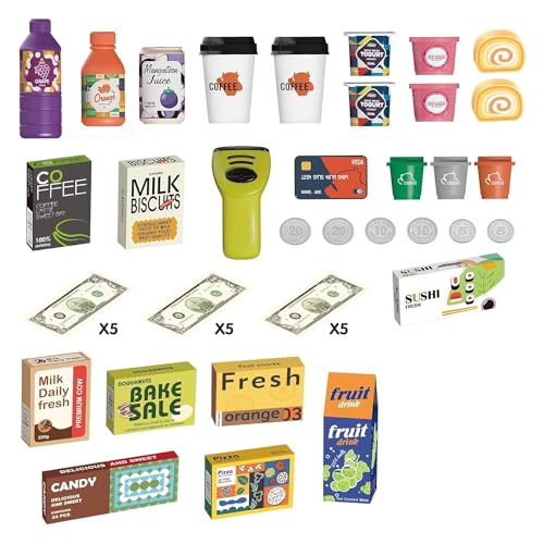 Interactive Cash Register Playset for Kids & Imaginative Role Play with Friends and Parents.Are you looking for toys that can teach your little one to the gross motor skills and math skills?Are you looking for the gift for your child/grandchildren/nephews and nieces at New Year, Birthday or any other special occasion?This toy cash register is also a ideal choice if you’re looking for some toys to make kids busy and occupied while you are reading a book doing housework or something else. Our cash register provides a fun and educational way for your kids to learn and play, while giving you a break to relax and recharge.46-Piece Pretend Play Sets.This supermarket playset includeds pretend play food,scanner,Cash.Perfect for role playing with friend or parents.Pretend To Scan The Product.The scanner lights up and makes a scanning sound when you pretend scan the products.Simulate real payment methods.Durable and Shatterproof.This cash register toy is very durable and shatterproof.Made of high materials,safe for kids.