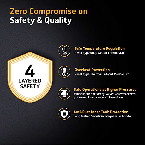 【SAFETY ASSURED】: IPX4 Splash Proof ABS Outer Body, Advanced Thermostat & Thermal Cut-out Mechanism provides Dual Overheat Protection, 5-in-1 Multi-function Safety Valve prevents Excessive Pressure Build-up, Vacuum Formation & Reverse Water Flow