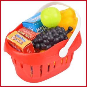 With 33pcs accessories like fake coins, play money for kids, credit cards, shopping basket and some food toys. Meet all play need.