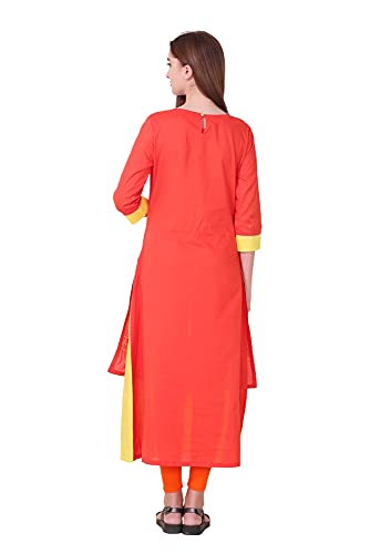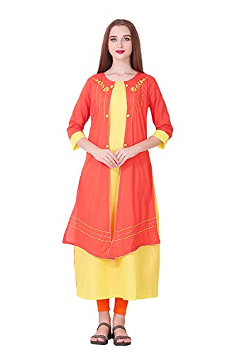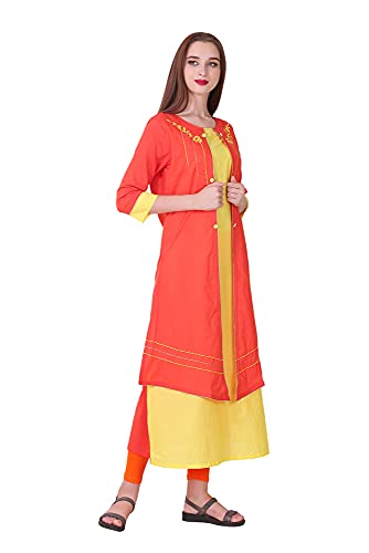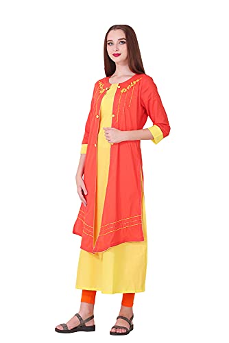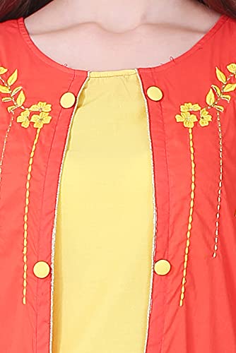 Spendworth Orange Yellow Cotton Round Neck Zari and Thread Embroidered Designer Kurti with Buttons On Front