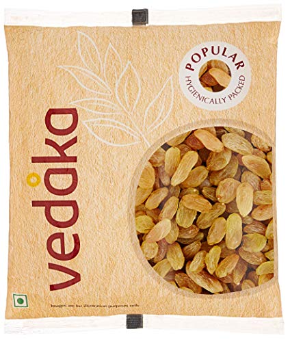 Vedaka brings to you high-quality regular-sized raisins with a sweet fruity taste and a soft chewy textyure. They are packed in a food-safe polybag to keep them safe in the journey to your home. These raisins are packed in an integrated nuts & dried fruits unit and may contain occasional traces of other nuts & dried fruits. May contain an occasional stem/ stalk Store in a cool, dry place in an airtight container and preferably refrigerate after opening.