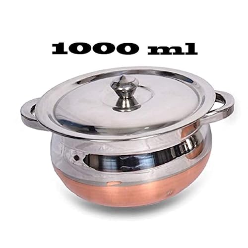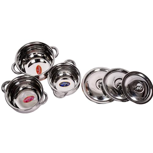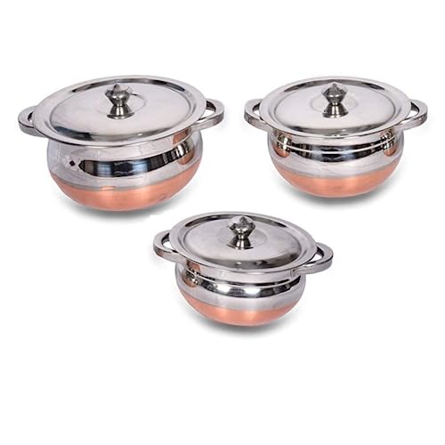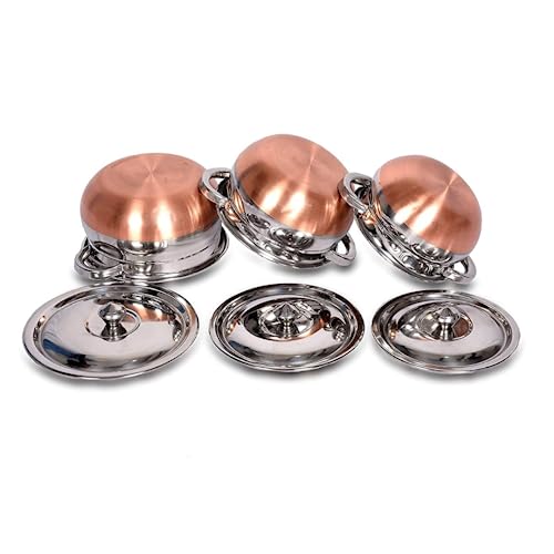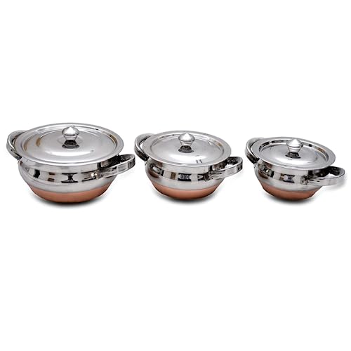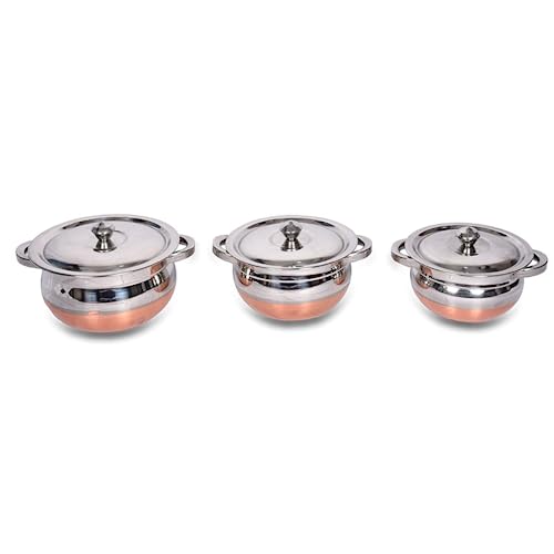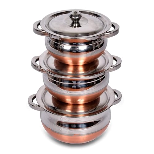 Copper Bottom Handi 3Pcs With Lid These Handi Are Is Only Attractive To Look But Also Has A Very Large Capacity. They Can Be Used Not Only To Cook Food, But At The Same Time Due To Their High Storage Space And Attractive Looks, you can use them as Cookware As Well As Serveware On Your Table Top. Premium quality is deep vessel height is useful to cook all type of food. Easy to clean and wash, they have very exotic silver shining. Highly durable and made of fine quality stainless steel.
