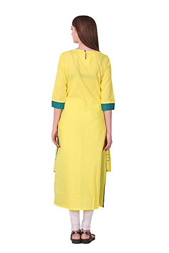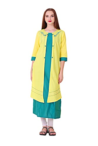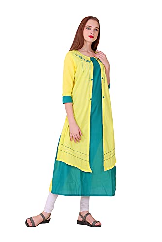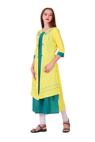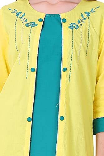 Spendworth Yellow Green Cotton Round Neck Zari and Thread Embroidered Designer Kurti with Buttons On Front