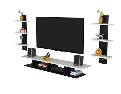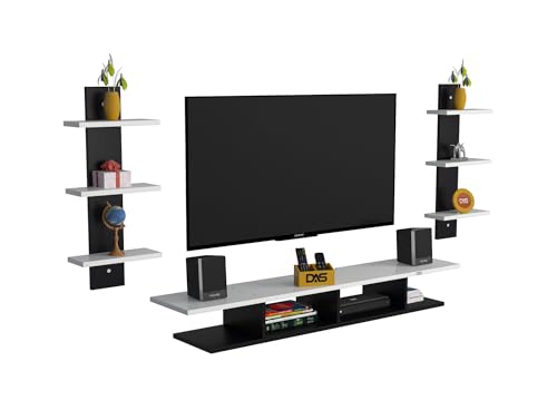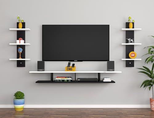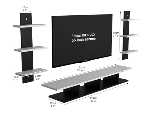 Keep your living space serene with this TV stands that is both modern yet reminiscent of the twenty-first century. Mount your TV on the wall above the four staggered compartments which are ideal for today’s assortment of compact electronic devices and 6 wall shelves/ display racks for decorative items like plants, photographs, display units etc.