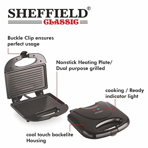 Sheffield Classic Sandwich Griller / Toaster , Non-stick fix grill plates for Home use with led on/off light indicator | 2 slices | Over heat protection |750 W | – Black Colour