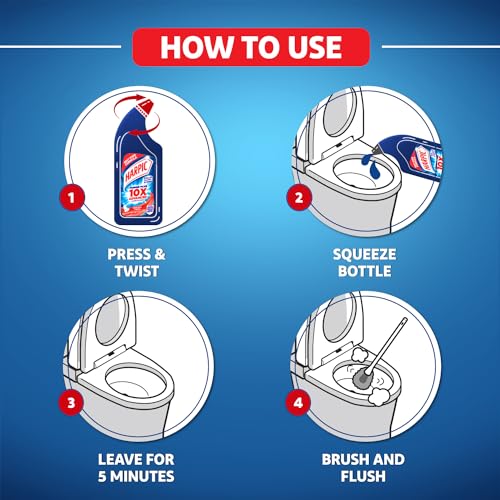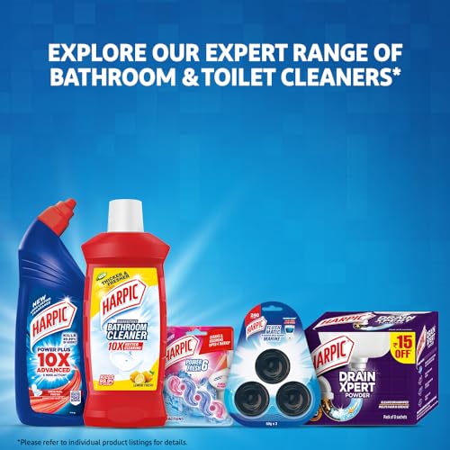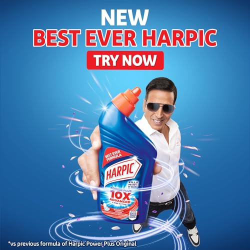Harpic Disinfectant Toilet Cleaner is the one stop shop for all toilet cleaning needs. Unlike ordinary cleaners, it combines the benefits of Tough stain removal^, 99.9% germ kill and Freshness. The result is a sparkling clean, hygienic, fresh and germ free toilet without any malodour with every use of Harpic. 5x power action: 5 times better at lime scale removal VS ordinary cleaners, Helps eliminate mal-odour, Clings to attack stains, Kills all germs. India’s #1 Toilet Cleaner*. Always use Harpic toilet cleaner separately. Do not mix with other products. *Reckitt Benckiser calculation based on data reported by NielsenIQ through its Retail Index Service for the Cleaners – Toilet Category, value for the 12-month ending June 30, 2022, for the India (U+R) market. (Copyright © 2022, NielsenIQ). ^Please refer to individual pack for details. #Kills 99.9% germs post 5 minutes contact with undiluted product.