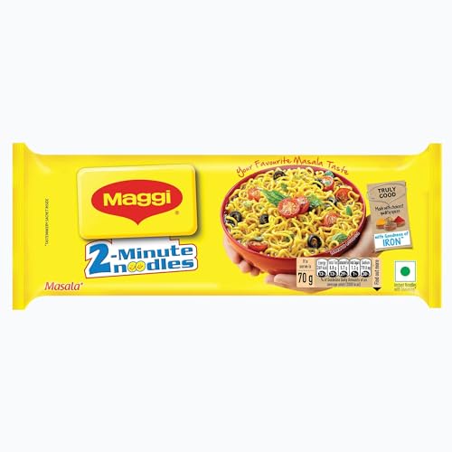 MAGGI 2-Minute Instant Masala Noodles is a favorite among people of all ages. MAGGI Masala instant noodles now come with the goodness of iron. Each portion (70g) of MAGGI masala noodles provides you with 15% of your daily iron requirement. It is just the perfect choice for those who need a quick and satisfying meal. MAGGI instant noodles are made with the choicest quality spices and ingredients to provide a great taste and experience. Usage instructions: Prepare a delicious meal in just 2 minutes with MAGGI – boil 1 cup of water and add the tastemaker along with the noodle cake broken into 4 pieces. Cook for 2 minutes in an open pan, while you stir occasionally. Do not drain the remaining water. Garnish with your favorite veggies and serve hot. Storage instructions: Store in a cool, dry and hygienic place to protect from insects, pests and strong odors.