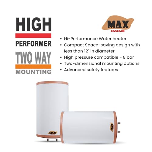 Material 304 Grade Stainless steel inner tank and ABS outer body Advanced Safety Features The water heaters comes with some of the most advanced safety features including multi-function safety valve, thermal cut-out to prevent over heating, flame-retardant cable, fuse nut to protect against shocks, and superior welding technology Pressure Compatibility Cascade Max can withstand pressure upto 8 Bar making it compatible with most homes and high raised buildings. Heating Element Cascade Max uses a 2Kw copper heating element coated with nickel to prevent corrosion and promote durability.