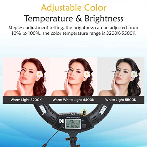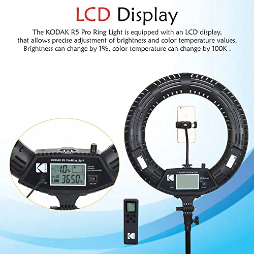 The KODAK R5 Pro Ring Light is equipped with an LCD display , that allows precise adjustment of brightness and color temperature values. Brightness can change by 1%, color temperature can change by 100K .