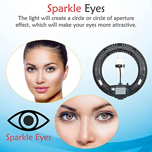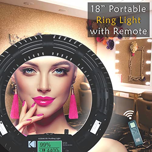 The KODAK R5 Pro Ring Light is an ideal product for professional photographers, videographers, the fashion, and the makeup industries. It improves the overall appearance of the subject by enhancing facial features by high lighting eyes. The Kodak R5 Pro Ring Light ensures a perfectly diffused light on the subject and makes the subject lighting evenly soft and gets rid of any annoying shadows. The round design also high lights the eyes making the pictures and videos livelier. The KODAK R5 Pro Ring Light Comes with a LED Display to show the various setting and parameters clearly on the screen and can be recorded for different subject requirements. The Light intensity and the color temperature can both be changed by the remote control from a distance and the remote also has a LCD display to show different settings. The KODAK R5 Pro Ring light comes with mirror and a flexible smartphone holder to help you get the ideal videos and selfies from your smartphone.