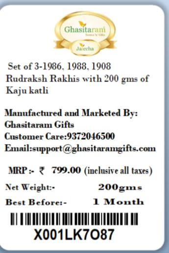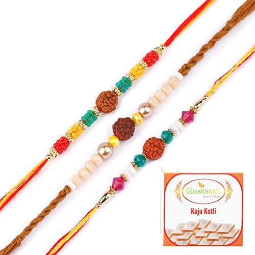 Ghasitaram Gifts Rakhi for Brother Rakhis Online – Set of 3-1986, 1988, 1908 Rudraksh Rakhis with 200 gms of Kaju katli
