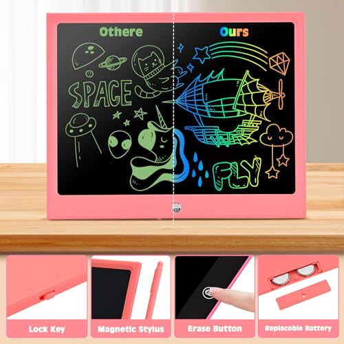 🎁【Erase Key & Screen Lock】The writing tablet creates colorful lines of different thickness, based on how hard you push with stylus, nails, or any hard thing, just like writing and drawing on paper. This LCD drawing tablet with erase key and screen lock, If your child want to the creation always display the screen, Just lock screen. When your child want to start a new creation, unlock the screen and press erase key to erase it.