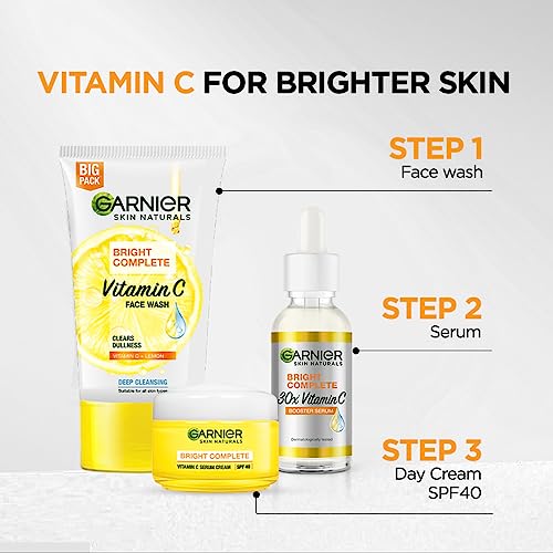 Garnier Light Complete Serum Cream with SPF40 / PA+++ is a moisturising cream that gives you spot-less, bright skin in just 1 week. The SPF40 in the serum cream protects your skin from the damage caused by harsh sun rays such as skin tanning, spots, and sunburns. Enriched with fresh Yuzu Lemon and 3X Vitamin C, its ultra-light formula absorbs quickly into the skin keeping it bright and spot-less, even in the sun. To use – Spread evenly on freshly cleansed face and neck, avoiding the delicate eye area. For best results, use as follows – in the day time, use Garnier Light Complete Face wash to cleanse, followed by the Garnier Light Complete Vitamin C Booster Serum and Garnier Light Complete Serum Cream with SPF 40/ PA+++ to brighen, moisturize and protect. Bonus step (after Step 1) – Garnier Light Complete Serum Sheet Mask – To intensely hydrate your skin and get a facial-like glow at home. At night, repeat the above steps while replacing the Garnier Light Complete Serum Cream with SPF 40/ PA+++ with Garnier Light Complete Yoghurt Night Cream.