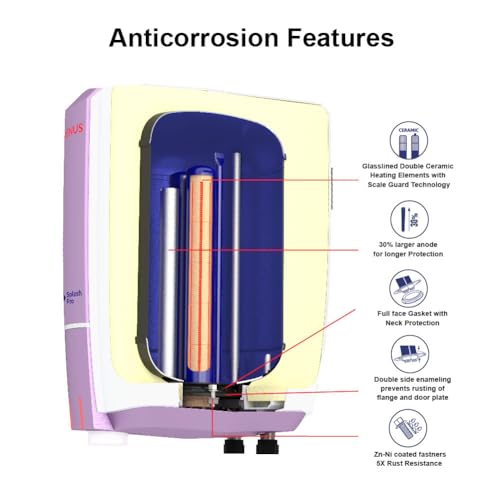“5 Anti-corrosive features- 1.Porcelain Enamel Glasslined tank 2.Double Side enameling prevents rusting of flange and door plate 3.Zn-Ni Coated fastenersfor 5X rust resistance 4.Full face gasket with neck protection 5. 30% larger Anode for longer tank protection”