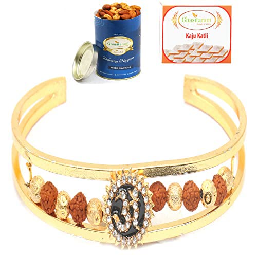 A beautiful Rudraksh Rakhi traditionally designed with pearls, stones and american diamonds to make it unique in its own way..This comes with Kaju katli or Dryfruits Mix Can which have been packed using Italian Technology for an Extended Shelf Life (30 days).Free Roli, Chawal and chandan pouches go along with this product.