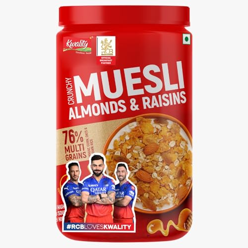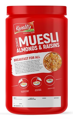 Kwality Muesli Almond, Raisins & Honey 1Kg Jar | 76% Multi Grains | No Maida | Natural Source of Vitamin & Iron | High in Protein & Fiber | Low Fat & Cholesterol free | Healthy Food & Breakfast Cereal