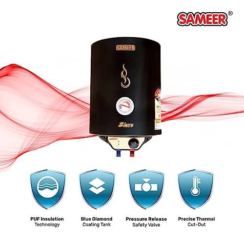 The Sameer Sicuro Glassline 15L 2000W Metal Black Storage Water Geyser is a high-quality water heater that is built to last. It features a durable metal construction and a black finish that will complement any home decor. If you are looking for a water heater that is both powerful and efficient, the Sameer water heater is the perfect choice for you. This water heater has a tank capacity of 15 litres and an energy rating of 4 stars, making it a great choice for those who want to save on their energy bills. The interior features a glass-lined tank, providing excellent insulation and heat retention while protecting the tank from rust and corrosion. Safety has been given utmost priority with features like an automatic thermostat, a safety valve, and overheat protection. The Sameer Sicuro Glassline provides not just hot water but peace of mind, making it a must-have addition to your home.