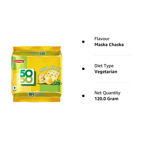 Britannia 50-50 Maska Chaska Salted Biscuits: A tea-time snack with the goodness of butter, peppered with choicest herbs. Crunchy, crispy, and savory, they offer a light, buttery flavor. Enjoy alongside your tea with other fresh and healthy Britannia favorites: Good Day, Tiger, NutriChoice, Bourbon, Milk Bikis, and Marie Gold.