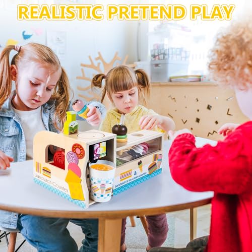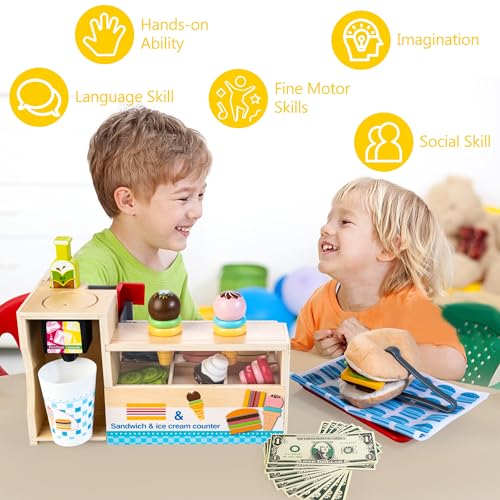 【54PCS WOODEN FOOD SET】 This wooden sandwich & ice cream counter set includes wooden counter with deli slicer, ice cream cones & toppings, sandwich rolls, sliced meat & cheese, lettuce, tomato, onion, cucumbers, olives, mayo, mustard, bacon, cup, tray, tongs, knife, dressing bottle, wrapper, menu, and pretend dollar 1/5/10 bills, 54 pieces in total for a complete play experience.