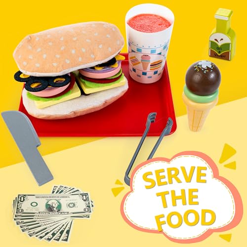 【REALISTIC PRETEND PLAY】Kids sandwich kitchen playset contains a deli-fresh slicer for meat and cheese pieces. The cup can really hold drinks, and the paper sign that has menu on one side and sandwich preparation instructions on the other, so kids can place orders, take orders, pay with play money and serve the food, replicating the entire experience, like how they act in their favorite restaurant.