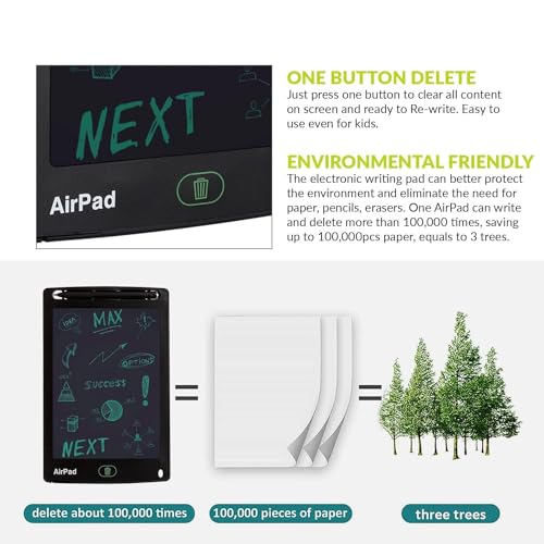 Tech-Bown :-[SINGLE-TAP ERASE] : A single tap on the ‘Clear’ button conveniently erases the content on the LCD Writing tablet, instantly. Keep that trash empty, and your content safe. Also protects your vision by being radiation-free, has no glowing colors or glares, and is fit for long hours- extra safe for your kids too!