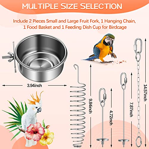 Package Content: the bird food holder set includes 2 pieces small and large bird fruit forks, 1 bird feeder hanging chain, 1 food basket and 1 feeding dish cup, which can meet your various needs when feeding birds, and spend a pleasant time with your birds