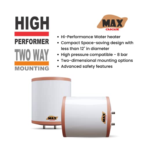 Material 304 Grade Stainless Steel inner tank and ABS outer body Advanced Safety Features The water heaters comes with some of the most advanced safety features including multi-function safety valve, thermal cut-out to prevent over heating, flame-retardant cable, fuse nut to protect against shocks, and superior welding technology Pressure Compatibility Cascade Max can withstand pressure upto 8 Bar making it compatible with most homes and high raised buildings. Heating Element Cascade Max uses a 2Kw copper heating element coated with nickel to prevent corrosion and promote durability.