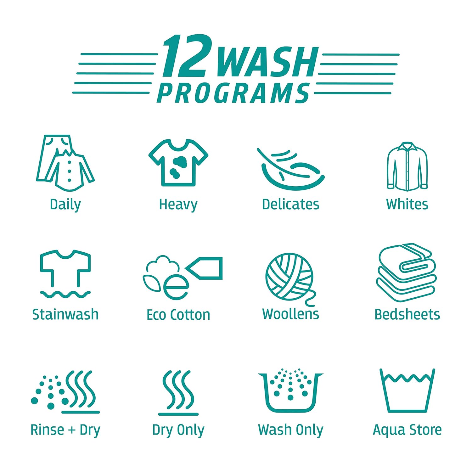 12 Wash Programs – Daily, Heavy, Delicates, Whites, Hard Water Wash, Eco Wash, Woollens, Bed Sheet, Rinse +Spin, Spin, Wash Only, Aqua Store